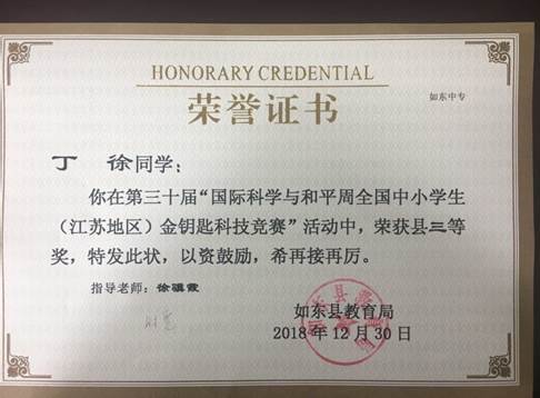 财经商贸系在2018年第三十届“国际科学与和平周全国中小学生(江苏地区)金钥匙科技竞赛”活动中荣获佳绩。王佳媛同学在第三十届“国际科学与和平周全国中小学生(江苏地区)金钥匙科技竞赛”活动中,荣获如东县二等奖,指导老师:陈小兵(17会计2班)。丁徐同学获得县三等奖,指导老师:徐骥霞(17商务英语班)。