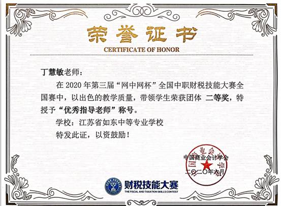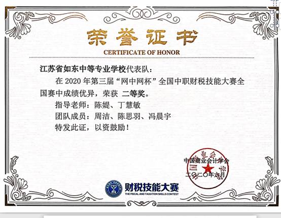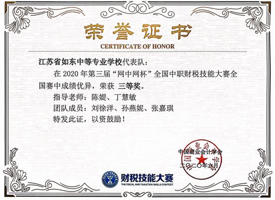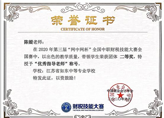 由财经商贸系陈媞老师、丁慧敏老师带队并指导的三支参赛队在2020年第三届“网中网杯”全国中职财税技能大赛中取得优异成绩。周洁、陈思羽、冯晨宇团队获得全国二等奖,刘徐洋、孙燕妮、张嘉琪团队以及汪宇航、曹思烨、徐陈宇团队获得全国三等奖。陈媞老师和丁慧敏老师被授予“优秀指导老师”称号。