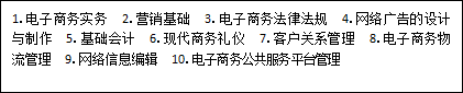 1、沟通协作技巧 2、电子支付 3、市场调查 4、信息搜集整理与分析 5、营销策划 6、网络推广 7、电子商务运营实务 |