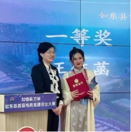 我校毕业生王钰菡近年创办了直播电商公司,在2022年江苏电商直播节暨首届江苏电商直播技能大赛中,她过关斩奖,获得一等奖;这次在县首届直播电商创业大赛中,再次展现不俗实力,勇获一等奖。