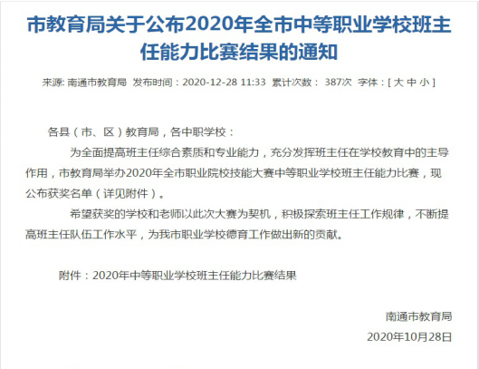 10月7日就要上交比赛材料,时间紧、任务重。学校分管校长及学工处领导都非常关注,实时跟进。孙丰妮老师所在的财经商贸系第一时间组建了团队,为她出谋划策,打磨班会课,并每天全程指导。拿出的所有方案几乎都是在否认——修改——再否认——再修改的过程中成形。孙丰妮老师更是牺牲了整个国庆假期休息时间,全力以赴,千锤百炼方有始终!最终孙丰妮老师取得了南通市中等职业学校班主任能力比赛业务能力组一等奖第一名的好成绩!